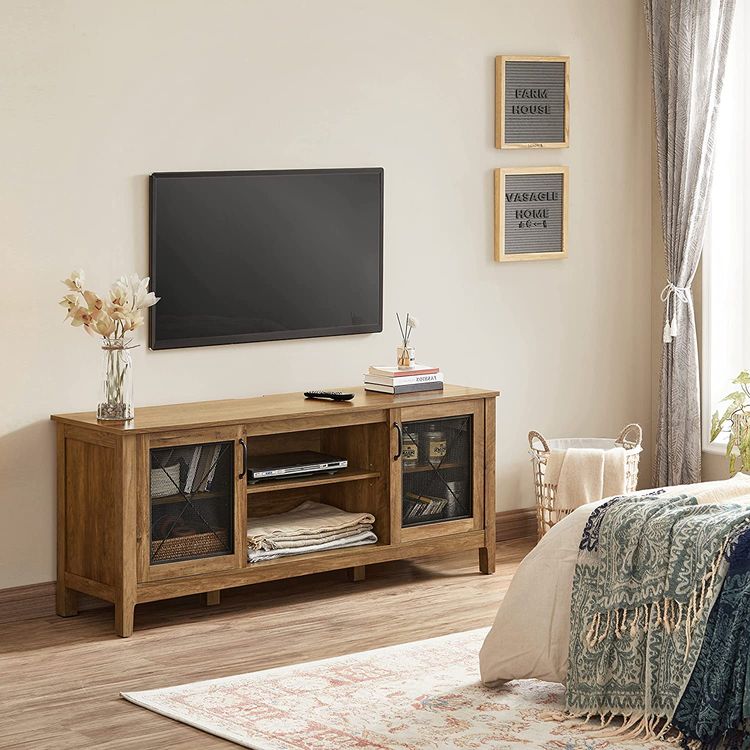 This stylish TV stand is inexpensive and versatile enough to fit in with many different design aesthetics. Its angled legs contribute to the vintage flair.It includes two open shelves for whatever you choose to show, while the cabinet allows you to store concealed items.